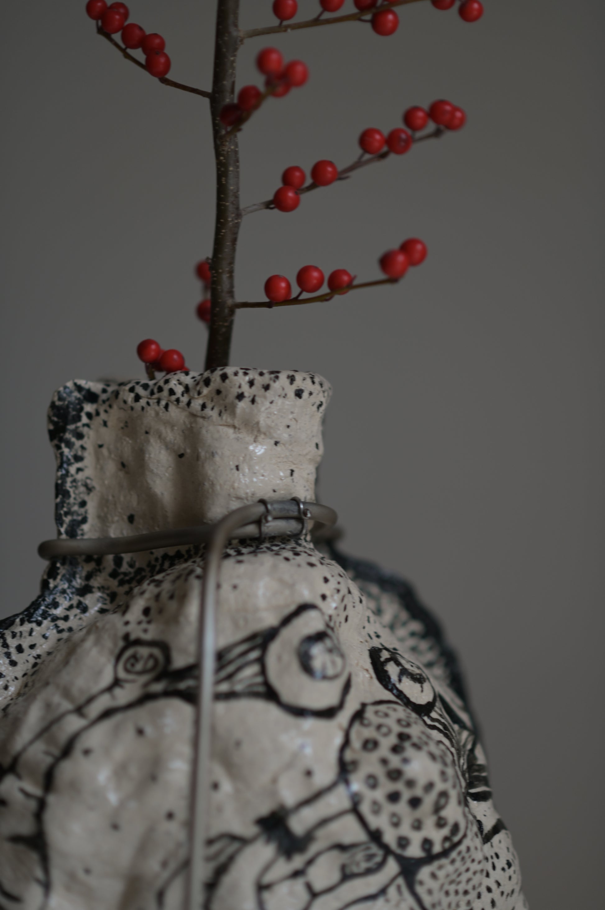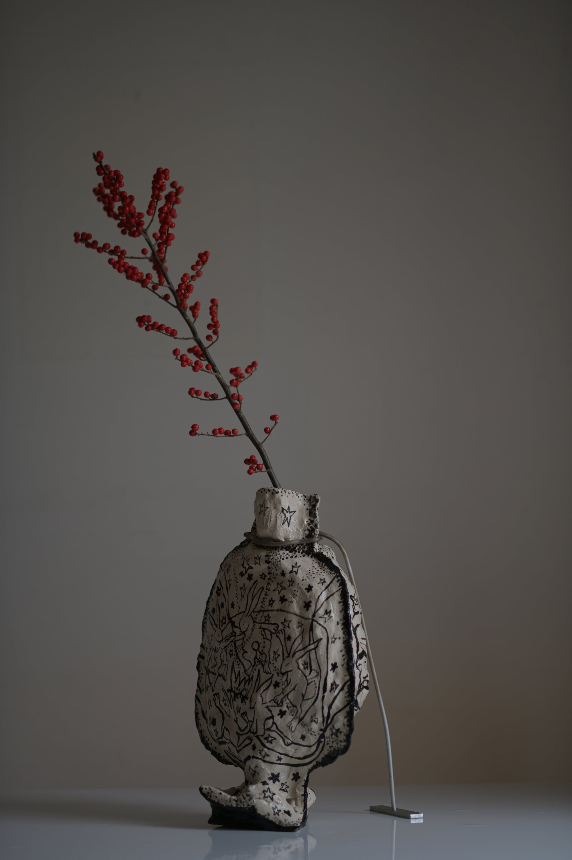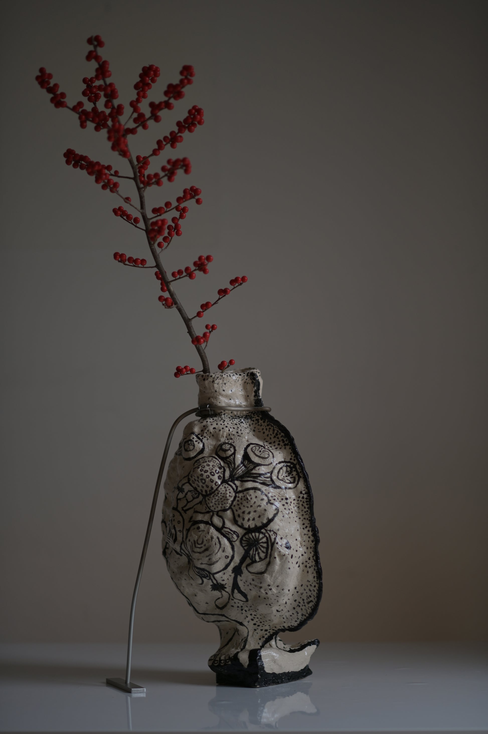 This piece is not watertight and is not suitable for pouring water. Intended for dried flowers or as a sculptural object. Clean gently with a dry or slightly damp cloth.